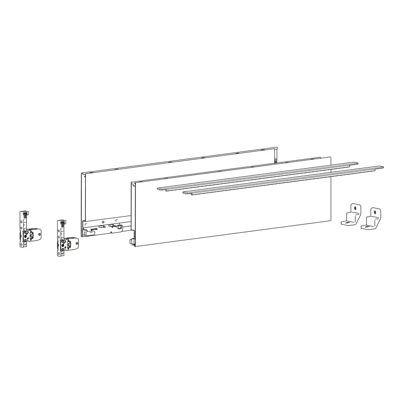 Coulisses vendues séparément.Le kit contient :- 1 profil de côté de tiroir, à droite et à gauche- 2 profilés design dans la couleur du profil de côté de tiroir- 2 attaches façade à visser- 2 stabilisateurs pour la paroi arrière- Accessoires de fixation