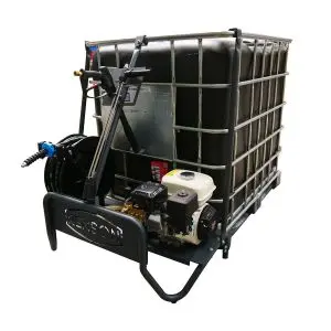 100% autonome : selon version le nettoyeur est équipé d’un réservoir IBC 1 000 L anti UV pour le stockage et le transport d’eau permettant de réaliser des travaux de nettoyage en toute autonomie 100% adaptable : nettoyeur adaptable sur tous les IBC professionnels du marché Sécurité et ergonomie : des supports accessoires innovants et pratiques et un enrouleur automatique permettent d’optimiser et de sécuriser l’espace de nettoyage Châssis : Acier peint époxyCouplage : DirectDébit (L/h) : 600Diametre du flexible : 3/8 »Filtre : Y en laitonFlexible (m) : 20Jauge de pression / Manomètre : OuiLance : DoubleMoteur : HONDA GP200Niveau sonore (dBA) : 94Poids (kg) : 110Pompe : RadialePuissance (CV) : 6.5Raccord d’entrée d’eau : GardenaRéservoir Carburant (L) : 3.1Reservoir Huile (L) : 1Tour/min : 3400Utilisation en continu maxi (h) : 2Pression de service (bar) : 160