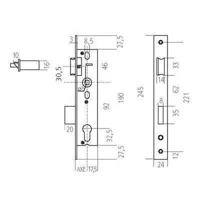 Livrée sans cylindre Entraxe (mm) : 92Carré (mm) : 8Axe (mm) : 40Verrouillage : A la cléNombre de points de fermeture : 1Finition têtière : InoxSection têtière (mm) : P 20 x 3Longueur têtière (mm) : 245demi tour : –