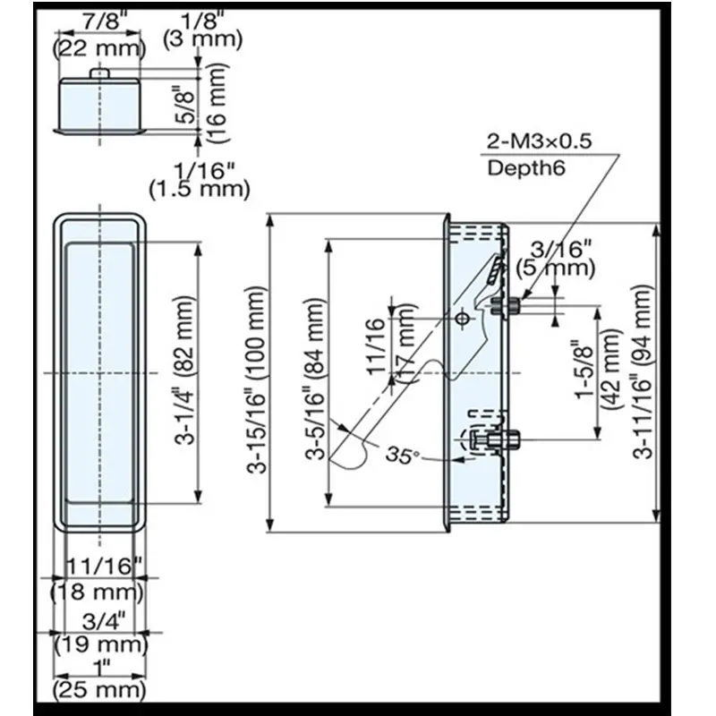 Le levier est maintenu en position fermée grace a un ressort. Décor : Chromé matLargeur (mm) : 25Hauteur (mm) : 100Epaisseur de porte mini (mm) : 25Encastrement (mm) : 82 x 19Profondeur (mm) : 16