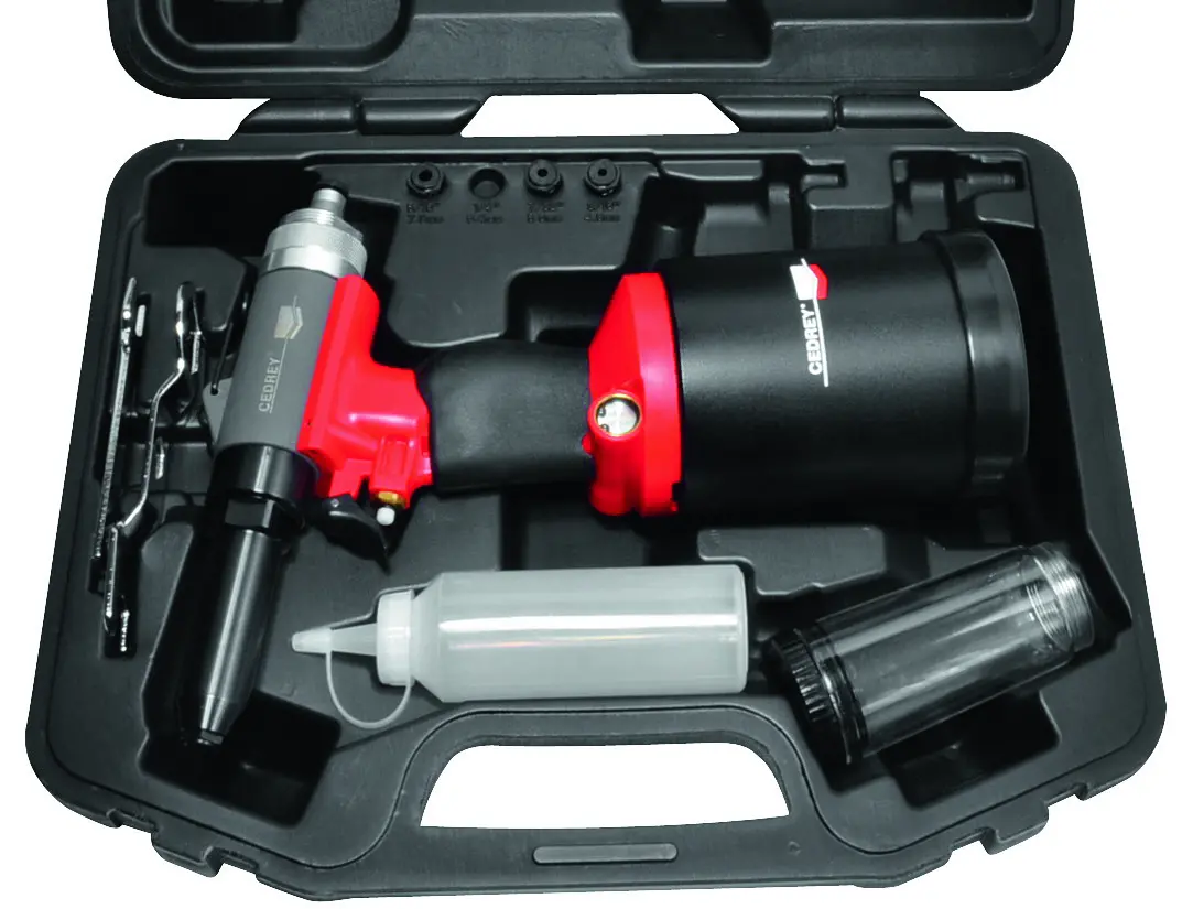 livrée complète en coffret avec manuel et clés de service. Course (mm) : 23Traction (N) : 18000,00Embouchures : 3,2 – 4 – 4,8 – 5,6 – 6,4 & 7,8 mmConsommation (l) : 1,00Poids (kg) : 1,88Capacité (mm) : 7,8Raccordement : 1/4 » BSP tournantPression d’alimentation (bar) : 6Niveau sonore (dBA) : 75