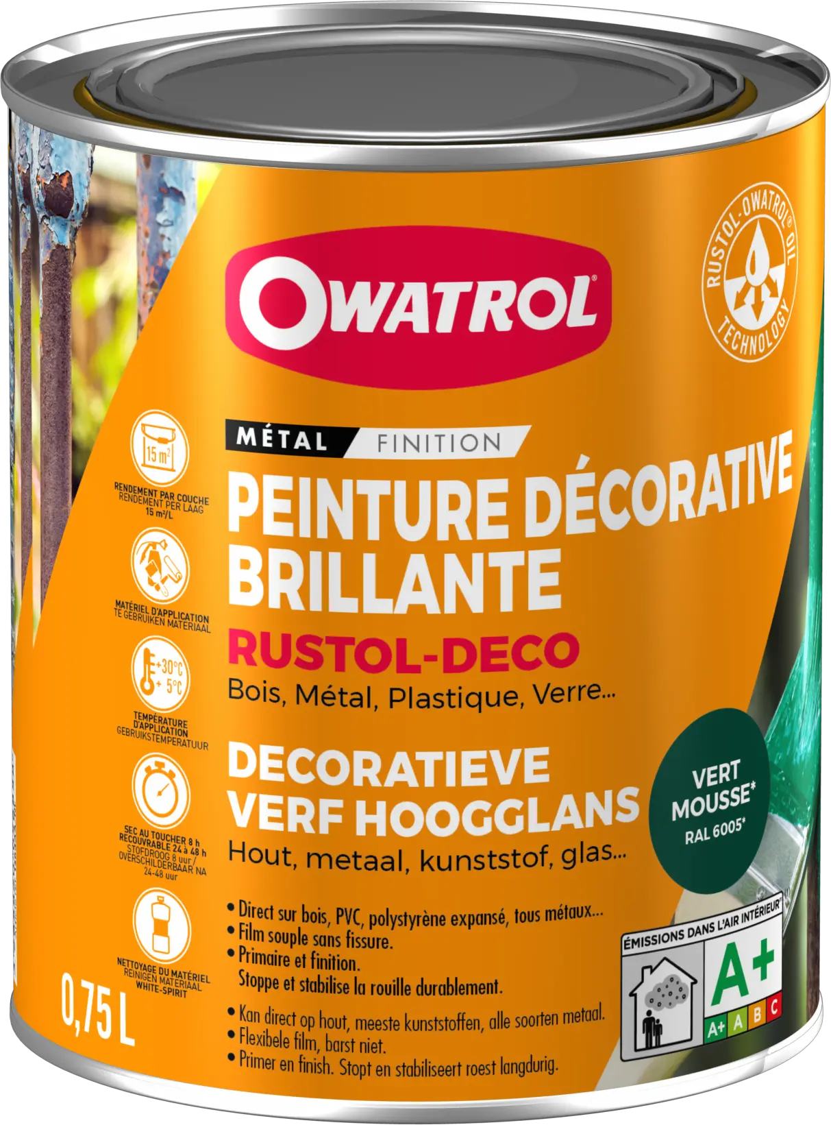 Découvrez RUSTOL DECO VERT MOUSSE BRILLANT RAL 6005 (0.75L) – 1364AA/NL – OWATROL de OWATROL, réf. 1364AA/NL. RUSTOL-DÉCO est une peinture antirouille qui assure une protection antirouille renforcée et décorative sur tous supports.